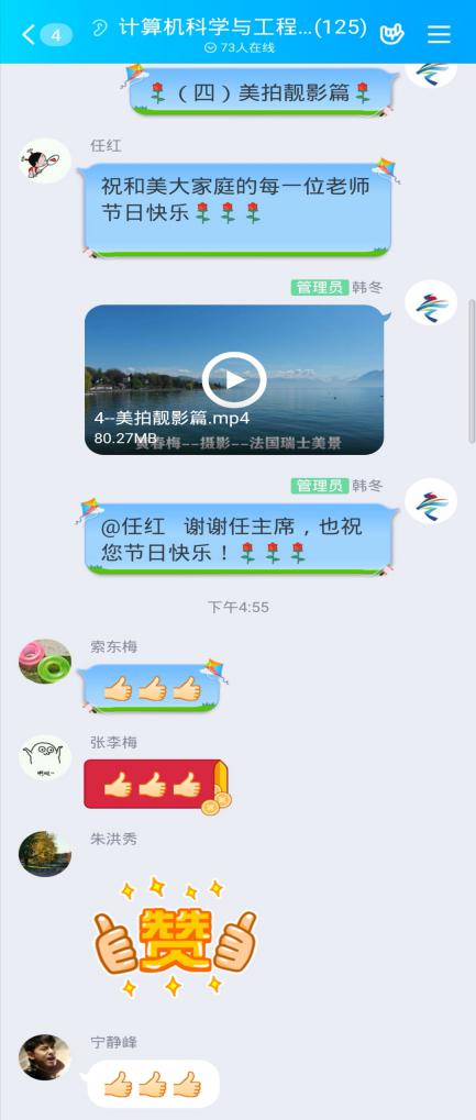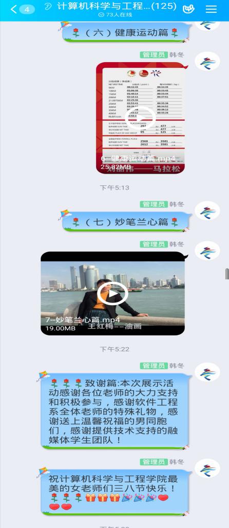 活动方案发出后,得到了女教师们的热情响应和大力支持,大家积极准备,参加展示的图片、视频等素材近50份。其中最引人注目的是软件工程系全体老师展示的作品--诗朗诵《巾帼赞歌》,7分钟的视频中,老师们饱含深情的朗诵,不仅表达了对工大女教师巾帼风采的赞美,更表达了为教育事业贡献力量的决心。