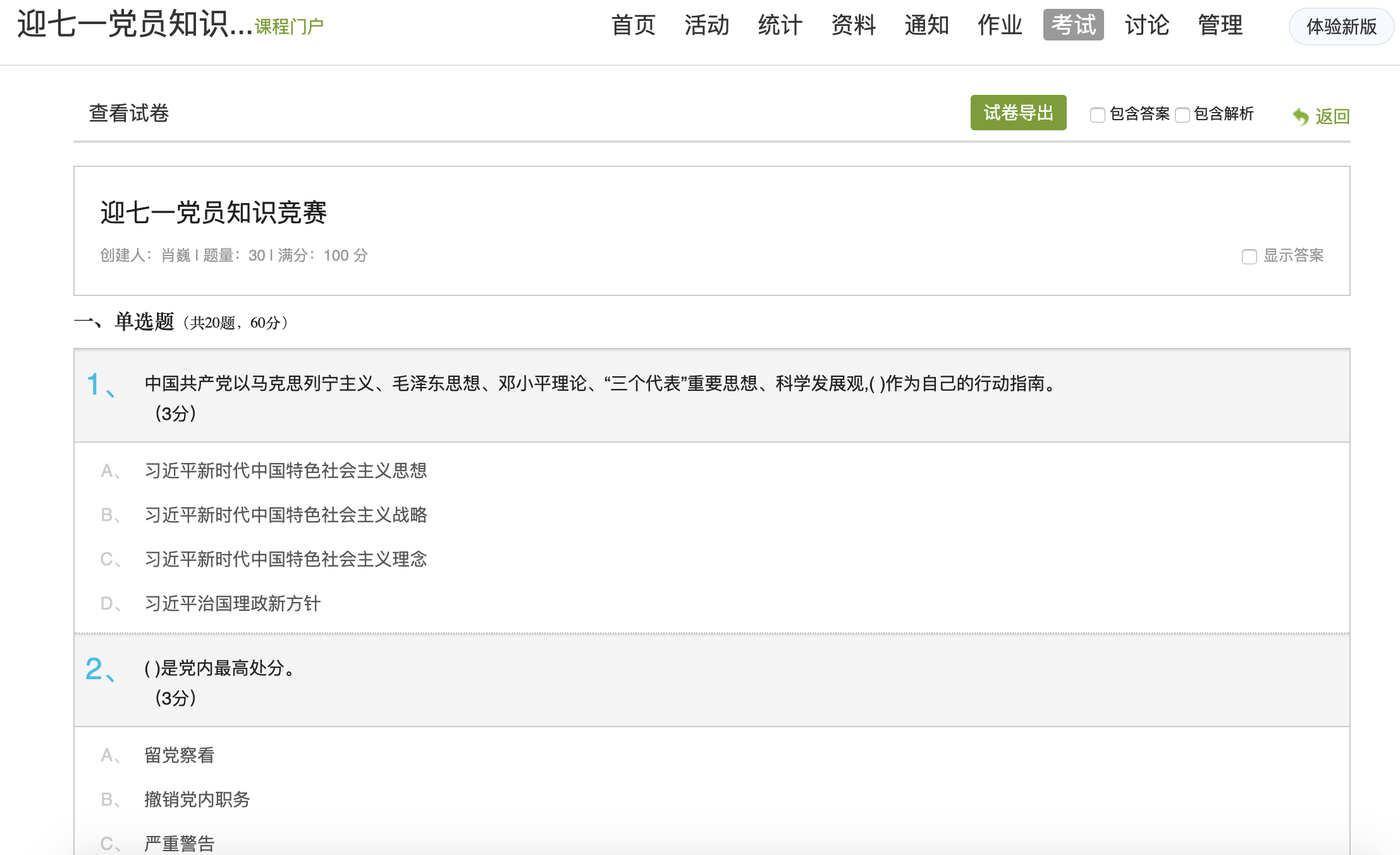 (撰稿人:肖巍)为深入学习贯彻习近平新时代中国特色社会主义思想和党的十九大和十九届二中、三中、四中全会精神,为纪念中国共产党成立99周年,巩固和拓展“不忘初心、牢记使命”主题教育成果,进一步提升基层党组织的凝聚力和战斗力,激发各级党组织和广大党员在脱贫攻坚、疫情防控、特色高水平应用研究型大学建设等各项工作中充分发挥战斗堡垒和先锋模范作用,计算机科学与技术系党支部和实验中心与办公室联合党支部于2020年6月30日12:30-13:00在超星学习通钟联合举办了网络答题知识竞赛活动。