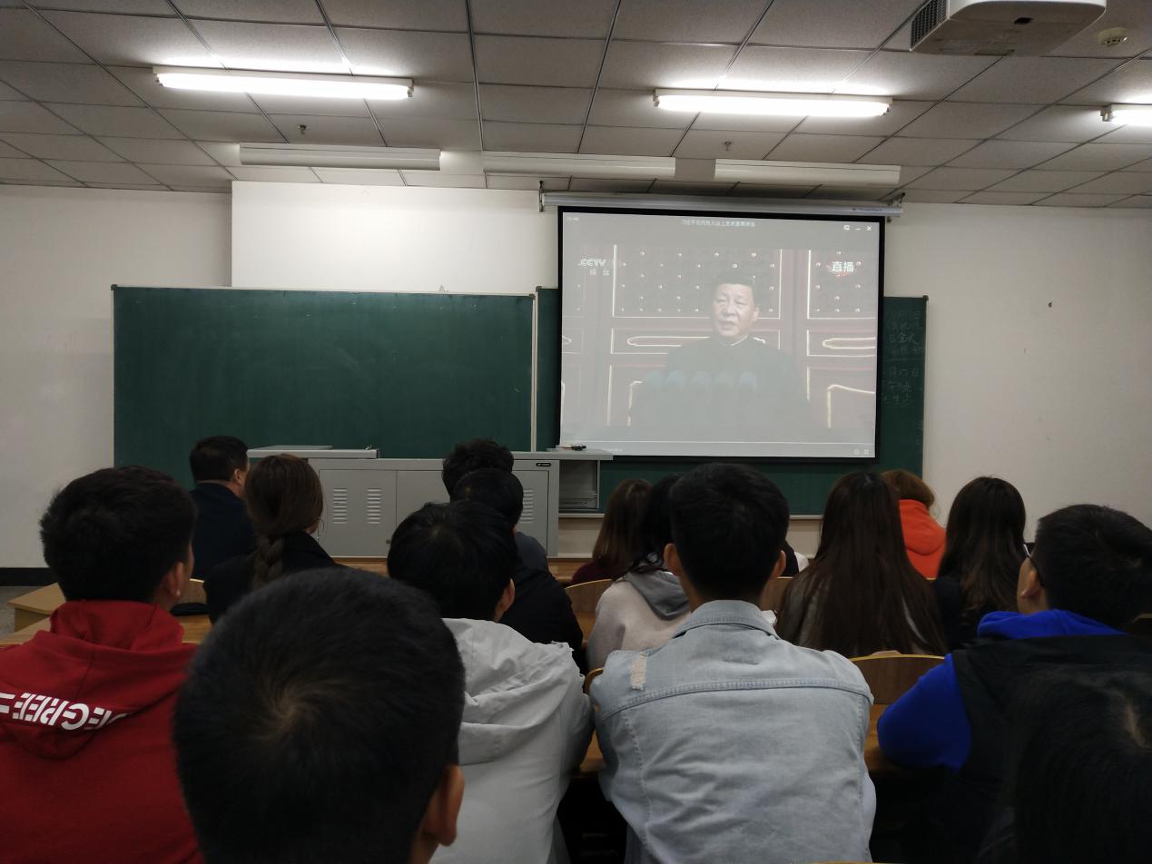 在建国70周年大会上,习近平总书记阐明了新中国成立历史的重要意义,新征程的大政方针,要始终坚持和平发展道路,奉行互利共赢的发展战略,继续同世界各国人民一道推动共建人类命运共同体。习总书记强调,前进征程上要坚持共产党领导,坚持人民主体地位,全面贯彻执行党的基本理论、基本路线、基本方略。在今天,没有任何力量能够撼动我们伟大祖国的地位,没有任何力量能够阻挡中国人民和中华民族的前进步伐。观看过程中同学们精神饱满,观看现场气氛热烈。
