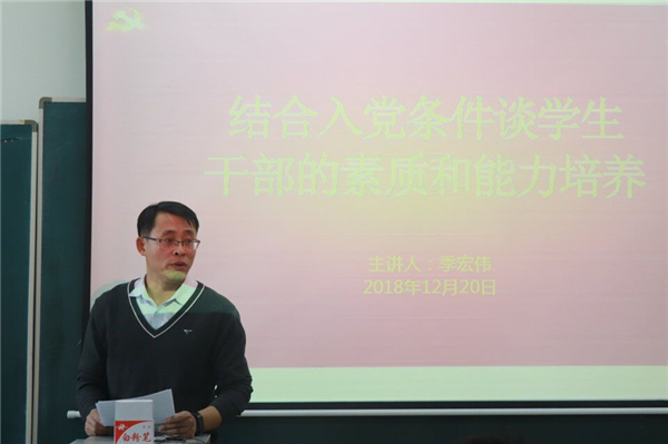 专职组织员薛勇宣读了培训计划,并强调每一位学员要做到严格要求自己,认真完成学习和考核任务,争取早日成为一名光荣的共产党员。随后,季宏伟老师以结合入党条件谈学生干部的素质和能力培养为题为大家讲授了培训班的第一课。首先提出同学们要端正自己的入党动机,他强调,只有思想上入了党,组织上才能入党,入党不是盲目的跟风,而是自己主观意识的驱动,是对党的崇高敬意和向往。进一步对学员们的素质和能力培养作出要求,通过17吃瓜