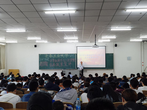 于北湖校区西阶202教室召开了2017年大学生征兵政策宣讲会。武装部部长郭立东、武装部副部长李文章、武装部颜术老师、16级辅导员庄园出席报告会,17吃瓜