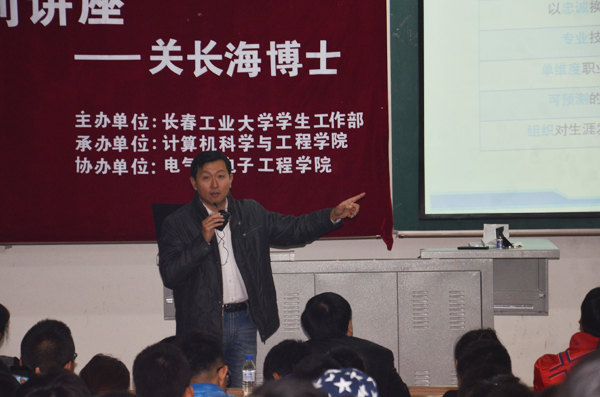 关长海博士将讲座分为“为什么要做职业生涯规划”、“生涯规划之‘九剑’”、“毕业,必然的选择”三大部分。首先,关博士告诉同学们只要向着目标努力就一定会成功,并用动漫和微电影等同学们易于接受的形式突出强调了目标的重要性,使同学们受到震撼。随后,关长海博士将职业生涯分为了九个方面,并对当今就业形势做出简单分析,强调了计算机行业将是未来的朝阳产业。同时告诉了同学们职业胜任力的重要性,希望各位同学们努力培养自己的内在素质和能力。最后,关长海博士提出了要认识自我,了解社会,抉择与奋斗等人生成功的要素。并与两个17吃瓜