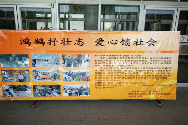 毕业生离 校之际开展了“鸿鹄抒壮志,爱心馈社会”的活动,为敬老院募集棉衣棉被、毛巾脸盆等生活物资。于7月11日,软件工程系党支部在宁书记的带领下,去范家屯 福利中心,亲自把这些募集到的东西交给敬老院的老人们。