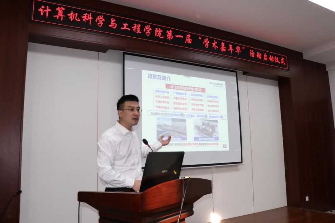 启动仪式后,副院长程超做了题为《浅谈科研能力培养与科研思维创新》的报告。主要介绍了走行部系统的背景简介、故障检测等相关内容,以及走行部系统的困难与未来的挑战。