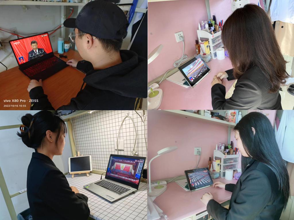 驻校教工在319智慧教室,学生代表在323大会议室集中观看,其他学生和教师以分组、居家等多种方式收听收看。师生们认真聆听习近平总书记代表第十九届中央委员会向大会所作的报告。大家精神振奋,热情高涨,欢心鼓舞,坚信全党全国各族人民在以习近平同志为核心的党中央坚强领导下,踔厉奋发、勇毅前行,定会谱写出全面建设社会主义现代化国家的崭新篇章。