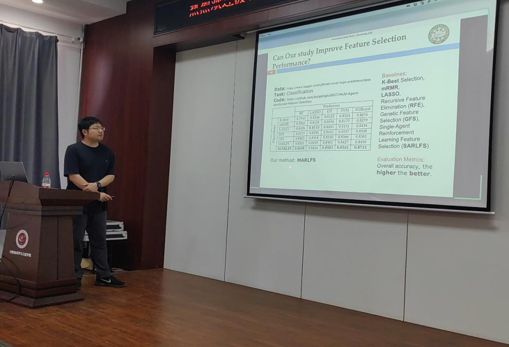 刘鲲鹏教授首先介绍自动化特征工程的重要性及其挑战性,并着重阐述了自动化特征选择及自动化特征生成。最后还为同学们展望了未来的智能化、可理解、可交互的自动化数据科学系统,并提出若干发展方向。学生们认真倾听了刘鲲鹏教授的学术报告,并进行提问互动。会后,17吃瓜