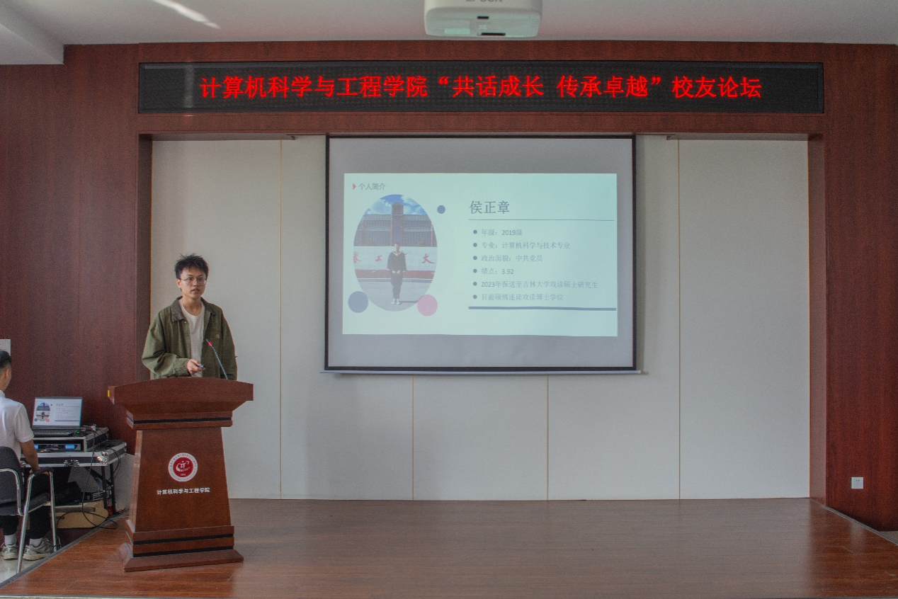 本次论坛特邀三位杰出校友做主题分享。2019级计算机科学与技术专业校友侯正章,现于吉林大学攻读博士学位,已在SCI一区、二区及中文核心期刊发表多篇学术论文,并担任多个国际会议与期刊审稿人。他以“在工大编程,在世界运行”为主题,系统回顾从本科至博士阶段的科研与学习心路,鼓励学弟学妹主动探索、勇于实践,强调“行动是青年最有效的磨砺”。
