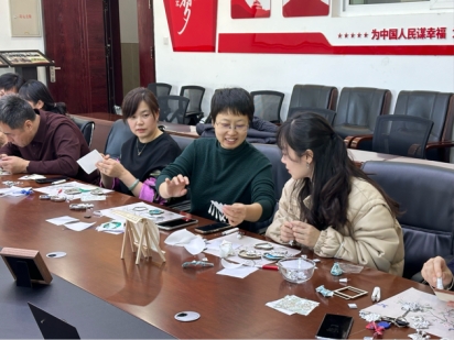 讲解过后,便进入了最令人期待的手作环节。大家仔细比对着宋锦的纹样与色彩,小心翼翼地剪裁出自己心中最满意的形状。随后,将充满民族风情的苗银饰片,与华美的宋锦进行创意组合、仔细粘贴、牢固装配。
